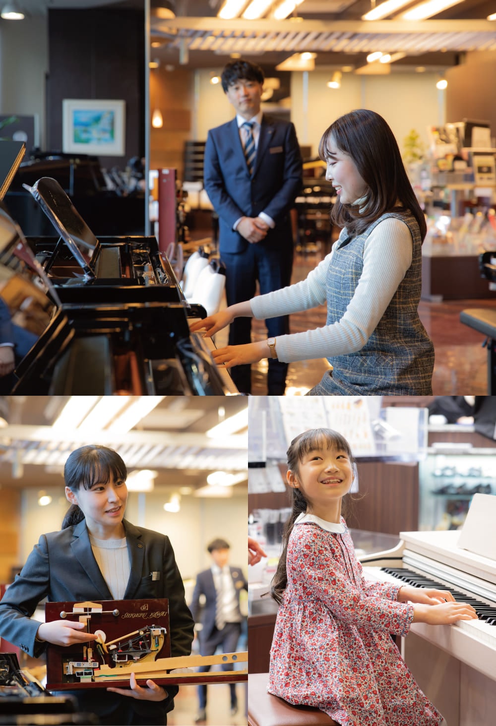 普段からピアノを弾かれる方はもちろん、 「ピアノは初めてで不安…」「弾けないけど見てみたい!」という方も お気軽にご来店ください。カワイのスタッフがひとつひとつ丁寧にご案内いたしますので、 気になることは何でもお気軽にお聞きください。